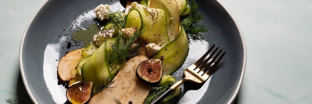 This salad is the perfect mixture of health, flavor, and romance! Sliced pear and figs are combined with curled cucumbers, tangy cheese, and a zesty dill with a drizzle of olive oil, lime and honey to make for a delicious and nutritious dish.