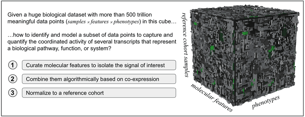 Once the design steps are finished and a set of features is defined, the complete feature set is algorithmically combined.  We aggregate the expression of the feature set using a weighted sum, to capture the activity of the overall mechanism.  Weights could be determined many ways – our current method is through Principal Component Analysis (PCA), because this method can rapidly determine each feature’s contribution to the total variance of expression across a cohort.  The description of this algorithm is beyond the scope of this blog, but perhaps will be described in a future blog.