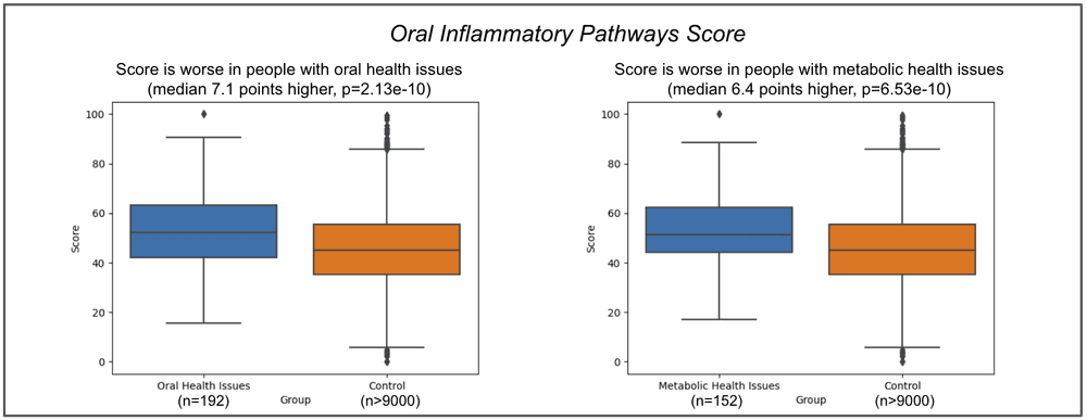 Based on these factors, we show here the association between the Oral Inflammatory Pathways score and the self-reported oral health issues (n=192) and metabolic health issues (n=152), within the Viome customer population.