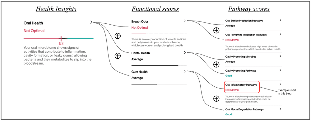 Throughout this blog, we have used Oral Inflammatory Pathways as a specific illustrative example of a molecular pathway.  This is one of dozens of molecular pathways that Viome evaluates to determine your health status.  Once we quantify multiple pathways, we aggregate them into “functional scores”.  For example, we combine the Oral Inflammatory Pathways score with the Oral Mucin Degradation Pathway score to quantify the Gum Health functional score.  Similarly, we combine the scores for Cavity Promoting Pathways and Cavity Promoting Microbes to determine the Dental Health functional score.  And the Oral Sulfide Production Pathways score and Oral Polyamine Production Pathway score to determine the Breath Odor functional score.  Finally, the Gum Health score, the Dental Health score, and the Breath Odor score are aggregated into the top-level Oral Health integrative score, which provides an overall assessment.