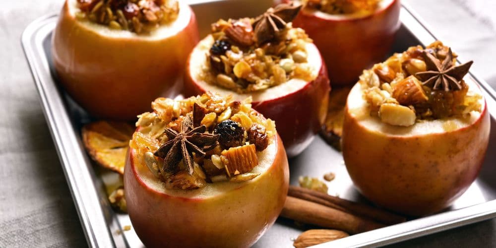 Preheat your oven to 375 degrees. Combine the butter, nuts, cinnamon, raisins and salt in a medium bowl. Evenly spoon the mixture into the cores of each apple. Place apples in a glass or metal baking dish and cover with aluminum foil. Bake for 30 minutes, and continue for another 20 with the foil removed, until the apples are tender. Remove and cool slightly. Serve warm.