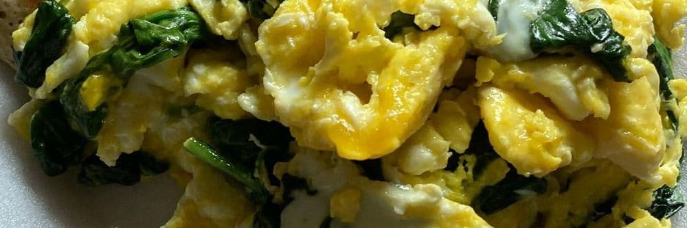 - Pour the egg mixture into the skillet with the spinach and cook, stirring occasionally, until the eggs are scrambled to your desired consistency.
