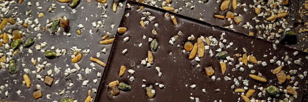- Sprinkle the nuts, seeds, and dried fruit evenly over the melted chocolate.