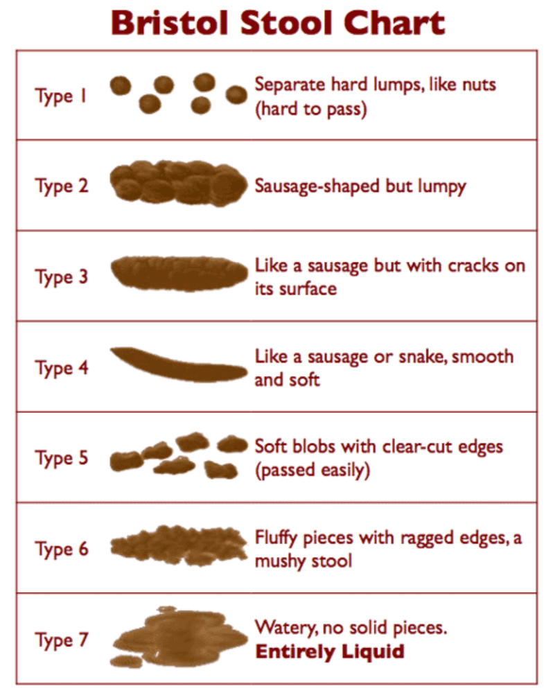 Although there isn’t a recommendation for how frequently you should go because it varies from person to person (and most likely day to day) the shape of your bowel movement can explain a lot about your digestive health. In fact, one of the easiest ways you can compare your poop is to consult your friendly “ Bristol Chart ,” an easily digestible – pun intended – infographic that helps you visualize how poop varies. This chart has been used in doctor’s offices across the nation and can reliably help you assess generalized gaps of health indicators from your digestion process by portraying the 7 different types of poop you may encounter.